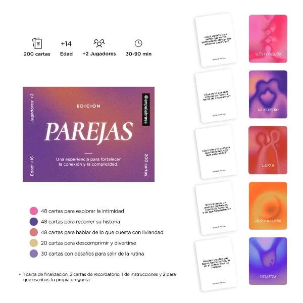 Con 200 cartas que mezclan preguntas y desafíos, este juego propone hablar mayormente —sí—, pero también pasar de la palabra al gesto, hacer planes, cuidar y sorprender. Porque para conectar, las palabras son una vía… pero no la única (y experimentarlas es la única forma de saber cuál les queda mejor).